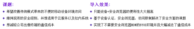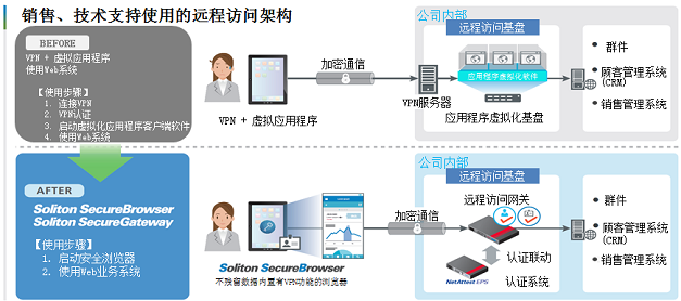 | 此次改革的基础上,安全启动VPN内置浏览器,可以直接访问公司内部的Web系统。利用者的使用性提高,也大幅减去了系统的导入·运用负荷。认证是除了由ID/密码识别用户之外,客户端还进行了数字证书认证。认证系统则采用了全内置认证设备的NetAttest EPS。 |