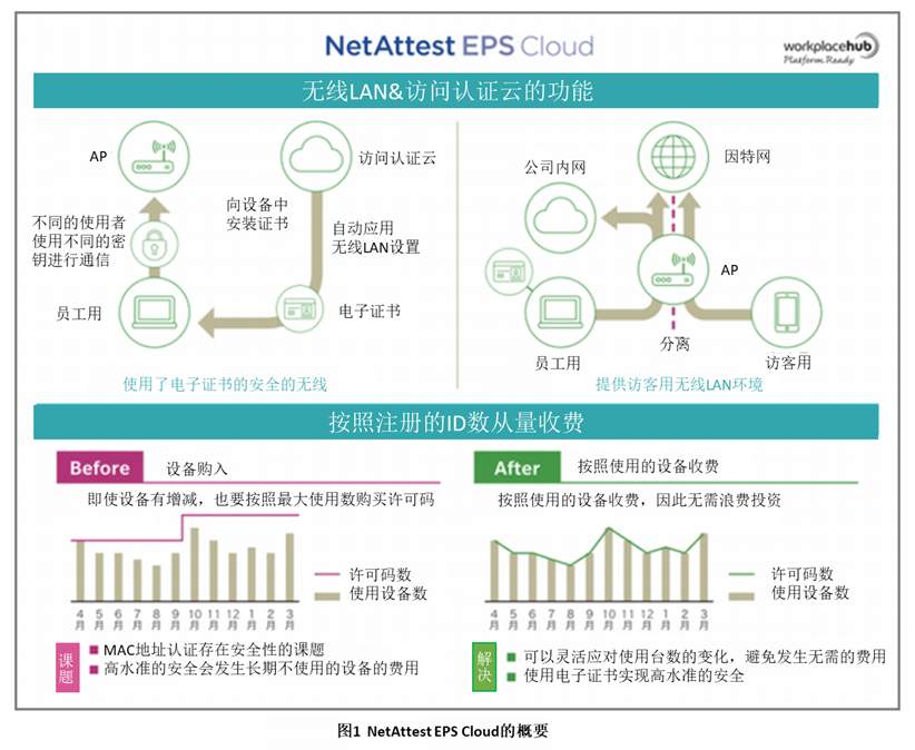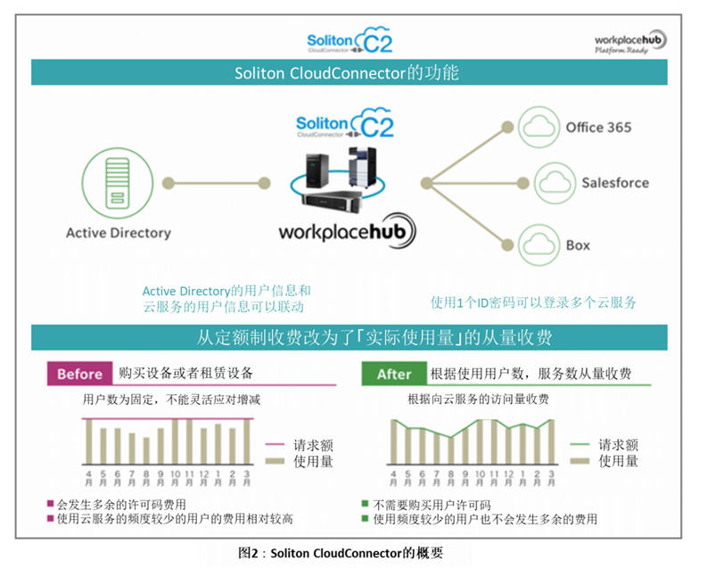 之前,要实现安全的IT环境不仅需要高度的技术,初期导入费用也比较高,因此在中小企业很难实现。认证服务NetAttest EPS Cloud以及ID管理产品Soliton CloudConnector与Workplace Hub Platform的联动可以提供从量收费的能够实现安全的IT环境的产品以及服务,优化成本。因此,可以控制初期投资以及运维费用的同时,能够为客户提供安全的网络环境。