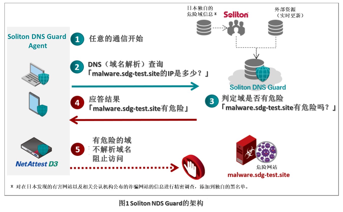 「Soliton DNS Guard」可以对比有害域名信息,提供可以阻止从安装了专用代理的终端访问有害域名的解决方案。由于能简单地追加在DNS(Domain Name System)级别的防御,因此最适合多层防御的强化。
