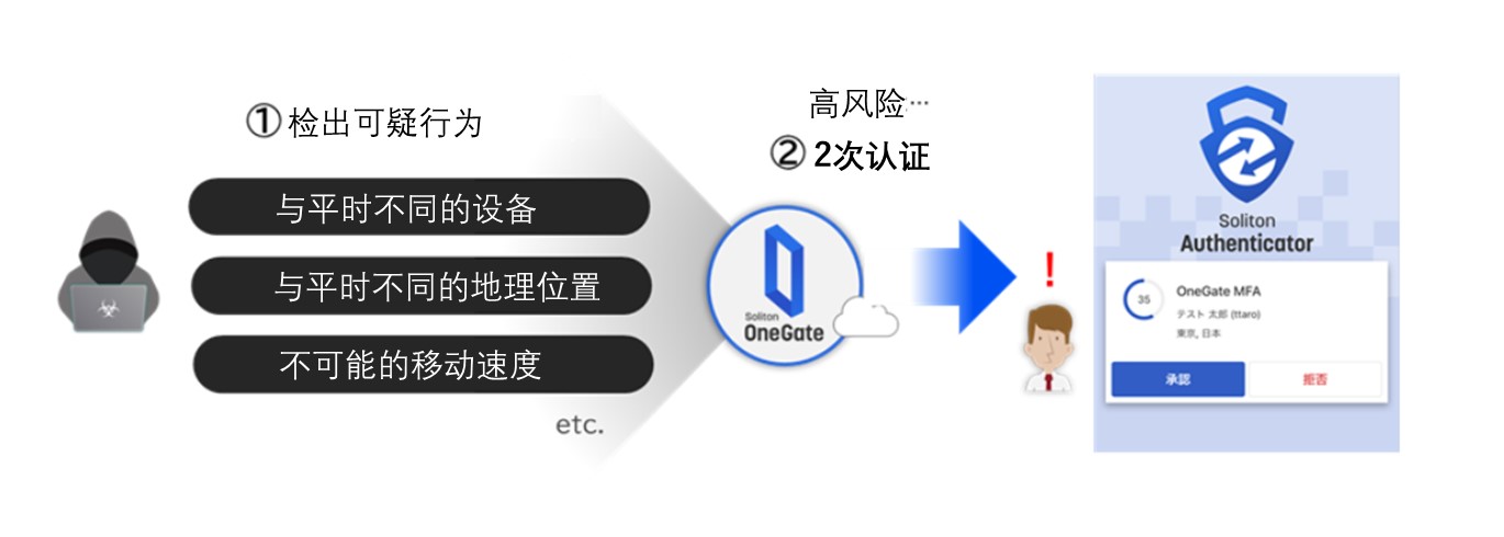 Soliton在2022年11月上旬,对Soliton OneGate进行了大幅度的更新,实现了首个作为支持基于风险的认证的日本产IDaaS云服务产品。在基于风险的认证中,根据使用设备、时间段、位置信息等动态评价登录时的行动,在检测到与平时不同的可疑行为时,寻求使用认证应用程序的追加认证(2次认证)。这样,即使是IT使用环境不同的集团公司和工作时间段不同的海外据点,也可以不花费很大的监视费用,降低侵入风险。
