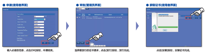 提供使用者通过Web浏览器可以申请、获取、更新证书的功能。因此,使用者将成为主体,可以大幅减轻管理员的管理负担。另外,可以向管理员提供审批功能,因而实现了证书分发的安全性。