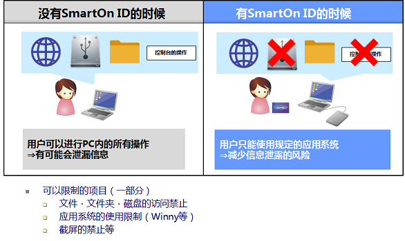 • <table border="0" cellpadding="1" cellspacing="1" style="width:500px"> <tbody> <tr> <td><span style="line-height:1.75em"><u><strong><span style="color:rgb(0, 0, 128)"><span style="font-size:18px"><span style="font-family:微软雅黑"><img alt="" src="/Uploads/images/20180205053330_7162.png" style="height:20px; width:11px" /><span style="font-family:宋体">用户认证</span></span><span style="font-family:宋体">的加强</span></span></span></strong></u></span></td> </tr> <tr> <td> <p><span style="line-height:1.75em"><span style="font-family:宋体"><span style="font-size:16px"><span style="color:rgb(0, 0, 0)"> 可以确定<span style="font-family:times new roman,times,serif">PC</span>使用者的多因子认证</span></span></span></span></p> </td> </tr> </tbody> </table> <p> </p> <p><img alt="" src="/Uploads/images/20180205041549_5464.png" style="height:278px; width:525px" /></p> <p> </p> <table border="0" cellpadding="1" cellspacing="1" style="width:500px"> <tbody> <tr> <td><span style="line-height:1.75em"><span style="font-family:宋体"><u><span style="color:rgb(0, 0, 128)"><strong><span style="font-size:18px"><img alt="" src="/Uploads/images/20180205053409_2540.png" style="height:20px; width:11px" />人体认证(脸)对应</span></strong></span></u></span></span></td> </tr> <tr> <td><span style="line-height:1.75em"><span style="font-family:宋体"><span style="font-size:16px"><span style="color:rgb(0, 0, 102)"> </span><span style="color:rgb(0, 0, 0)">人体认证的优点</span></span></span></span></td> </tr> </tbody> </table> <p> </p> <p><img alt="" src="/Uploads/images/20180205041705_5058.png" style="height:245px; width:538px" /></p> <p> </p> <table border="0" cellpadding="1" cellspacing="1" style="width:500px"> <tbody> <tr> <td><span style="font-family:宋体"><span style="font-size:18px"><u><strong><img alt="" src="/Uploads/images/20180205053428_8142.png" style="height:20px; width:11px" /><span style="color:rgb(0, 0, 128)">支持灵活的设定・运用</span></strong></u></span></span></td> </tr> <tr> <td> <p><span style="font-family:宋体"><span style="font-size:14px"> <span style="font-family:times new roman,times,serif"> [SmartOn Logon]</span></span></span></p> <p> </p> </td> </tr> </tbody> </table> <p><img alt="" src="/Uploads/images/20180205041935_3390.png" style="height:378px; width:587px" /></p> <p> </p> <table border="0" cellpadding="1" cellspacing="1" style="width:500px"> <tbody> <tr> <td><span style="line-height:1.75em"><span style="font-family:宋体"><u><strong><span style="font-size:18px"><span style="color:rgb(0, 0, 102)"><img alt="" src="/Uploads/images/20180205053454_1579.png" style="height:20px; width:11px" />访问控制</span><span style="color:rgb(0, 0, 102)">・</span><span style="color:rgb(0, 0, 102)">使用限制</span></span></strong></u></span></span></td> </tr> <tr> <td><span style="line-height:1.75em"><span style="font-family:宋体"><span style="font-size:16px"><span style="color:rgb(0, 0, 0)"> 访问控制・使用限制</span></span></span></span></td> </tr> </tbody> </table> <p> </p> <p><img alt="" src="/Uploads/images/20180205042133_1940.png" style="height:350px; width:586px" /></p> <p> </p> <table border="0" cellpadding="1" cellspacing="1" style="width:500px"> <tbody> <tr> <td><span style="line-height:1.75em"><span style="font-family:宋体"><u><strong><span style="color:rgb(0, 0, 128)"><span style="font-size:18px"><img alt="" src="/Uploads/images/20180205053512_6076.png" style="height:20px; width:11px" />只许可使用指定的<span style="font-family:times new roman,times,serif">USB/WPD</span></span></span></strong></u></span></span></td> </tr> <tr> <td> <p><span style="line-height:1.75em"><span style="font-family:宋体"><span style="font-size:16px"> 只能使用管理员登录的<span style="font-family:times new roman,times,serif">USB/WPD</span></span></span></span></p> </td> </tr> </tbody> </table> <p> </p> <p><img alt="" src="/Uploads/images/20180205042409_6883.png" style="height:173px; width:598px" /></p> <p> </p> <table border="0" cellpadding="1" cellspacing="1" style="height:210px; width:608px"> <tbody> <tr> <td> <div><span style="line-height:1.75em"><span style="font-family:宋体"><span style="font-size:16px"><img alt="0" src="/image/20120907_02.gif" style="height:14px; width:18px" /> 可以使用公司许可的<span style="font-family:times new roman,times,serif">USB/WPD</span>、私人的物品不能使用。</span></span></span></div> </td> </tr> <tr> <td> <div><span style="line-height:1.75em"><span style="font-family:宋体"><span style="font-size:16px"><img alt="0" src="/image/20120907_02.gif" style="height:14px; width:18px" /> 可以以用户为单位做控制。在使用其它的<span style="font-family:times new roman,times,serif">PC</span>时,也可以识别登录的用户,</span></span></span></div> <div><span style="line-height:1.75em"><span style="font-family:宋体"><span style="font-size:16px">   绑定于用户的<span style="font-family:times new roman,times,serif">USB/WPD</span>是可以使用的。</span></span></span></div> </td> </tr> <tr> <td> <div><span style="line-height:1.75em"><span style="font-family:宋体"><span style="font-size:16px"><img alt="0" src="/image/20120907_02.gif" style="height:14px; width:18px" /> 管理员可以对通常没有被许可的<span style="font-family:times new roman,times,serif">USB/WPD</span>发行[临时使用许可]的密码,</span></span></span></div> <div><span style="line-height:1.75em"><span style="font-family:宋体"><span style="font-size:16px">   可以灵活的运用。</span></span></span></div> </td> </tr> <tr> <td> </td> </tr> <tr> <td><span style="line-height:1.75em"><span style="font-family:宋体"><span style="font-size:12px">※ <span style="font-family:times new roman,times,serif">SmartOn ID V2.8.1.x </span>设备控制选项是,对应USB设备的<span style="font-family:times new roman,times,serif">Mass Storage Class(ClassID: