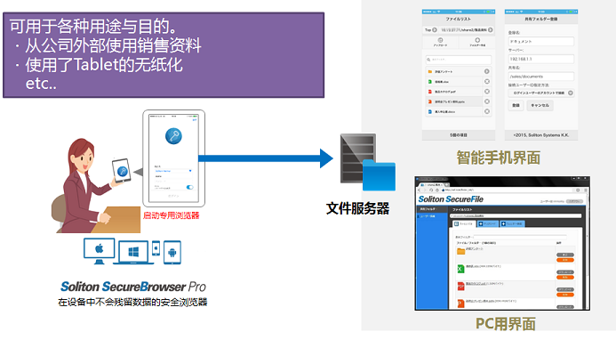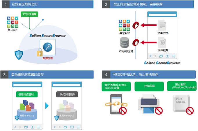 Soliton SecureBrowser是在安全的被保护的区域中运行的浏览器。作为专用的浏览器应用而提供。通过安全浏览器上的四个安全功能,大幅的降低了因数据的带出以及设备遗失导致的信息泄露风险。
