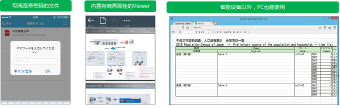 内置有可以预览MS Office以及PDF等主要文本的阅览器。阅览器具有很高的再现性,可用于使用了Tablet等设备的无纸化会议等。由于文本数据是在浏览器的安全区域内显示、因此可以防止信息泄露。